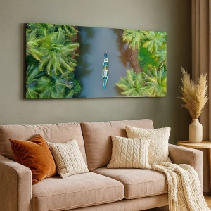Décoration murale - Sur un sentier tropical - Bateau sur une rivière entourée de palmiers, vue d'ensemble