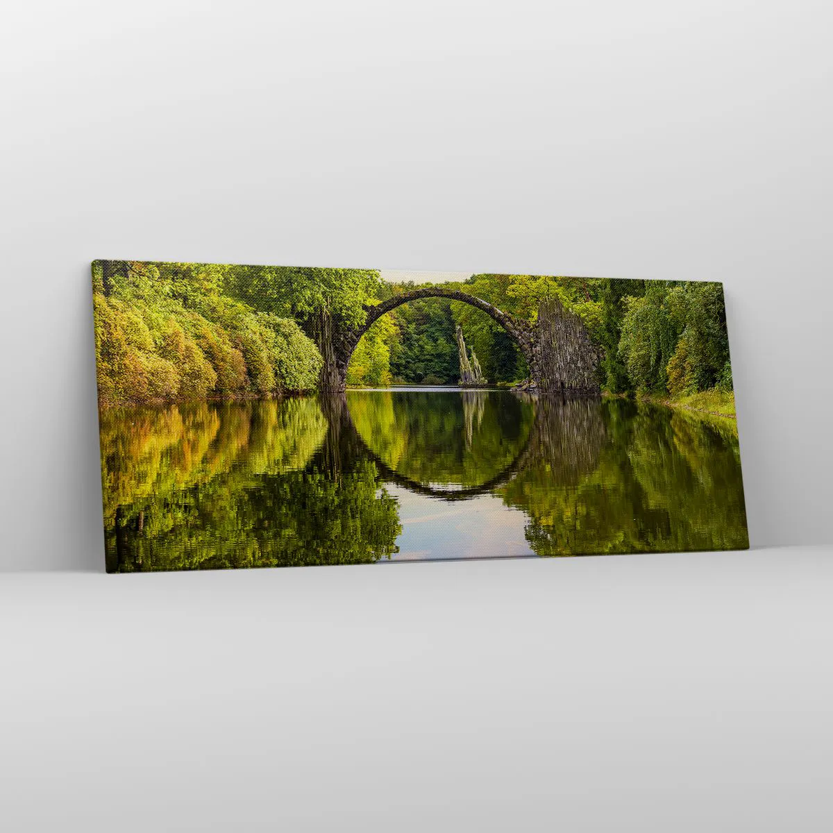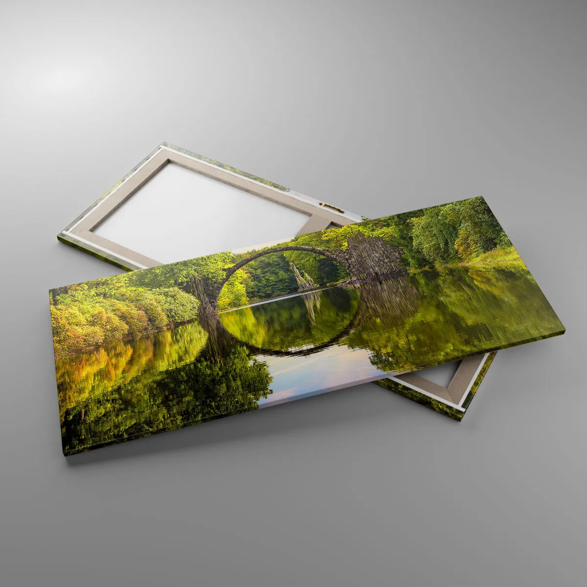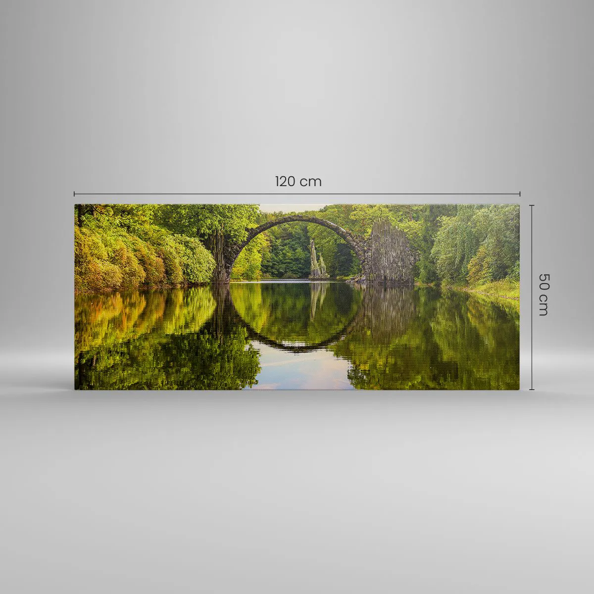 Impression sur toile - Image sur toile - Un pont de pierre sur une rivière avec un reflet parfait dans l'eau - 120x50cm - À la jonction de deux mondes - Décoration murale moderne pour le salon et la chambre ARTTOR
