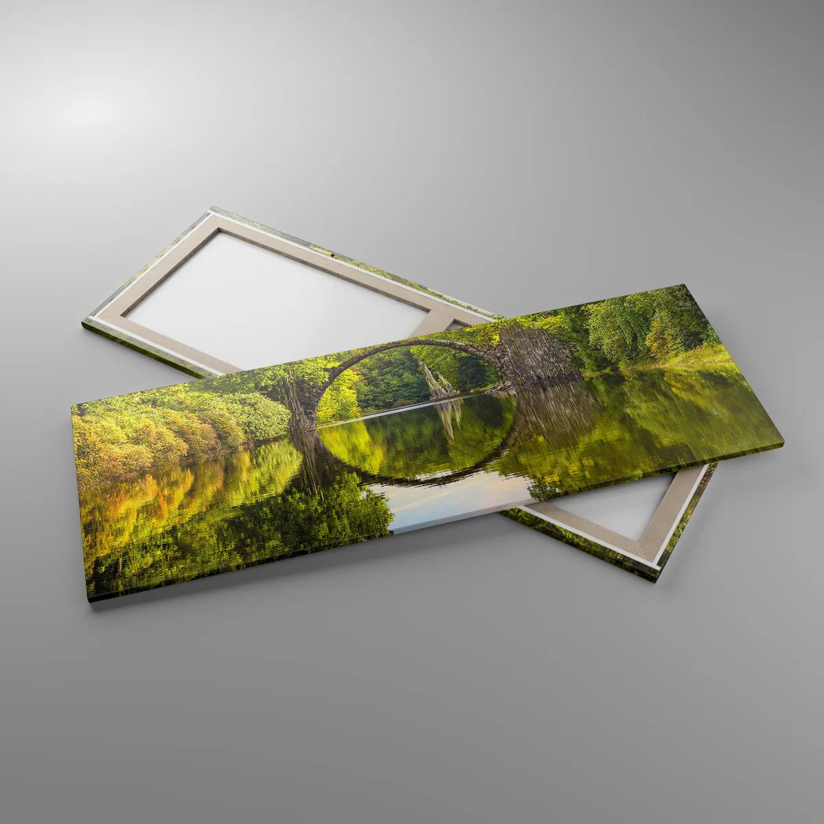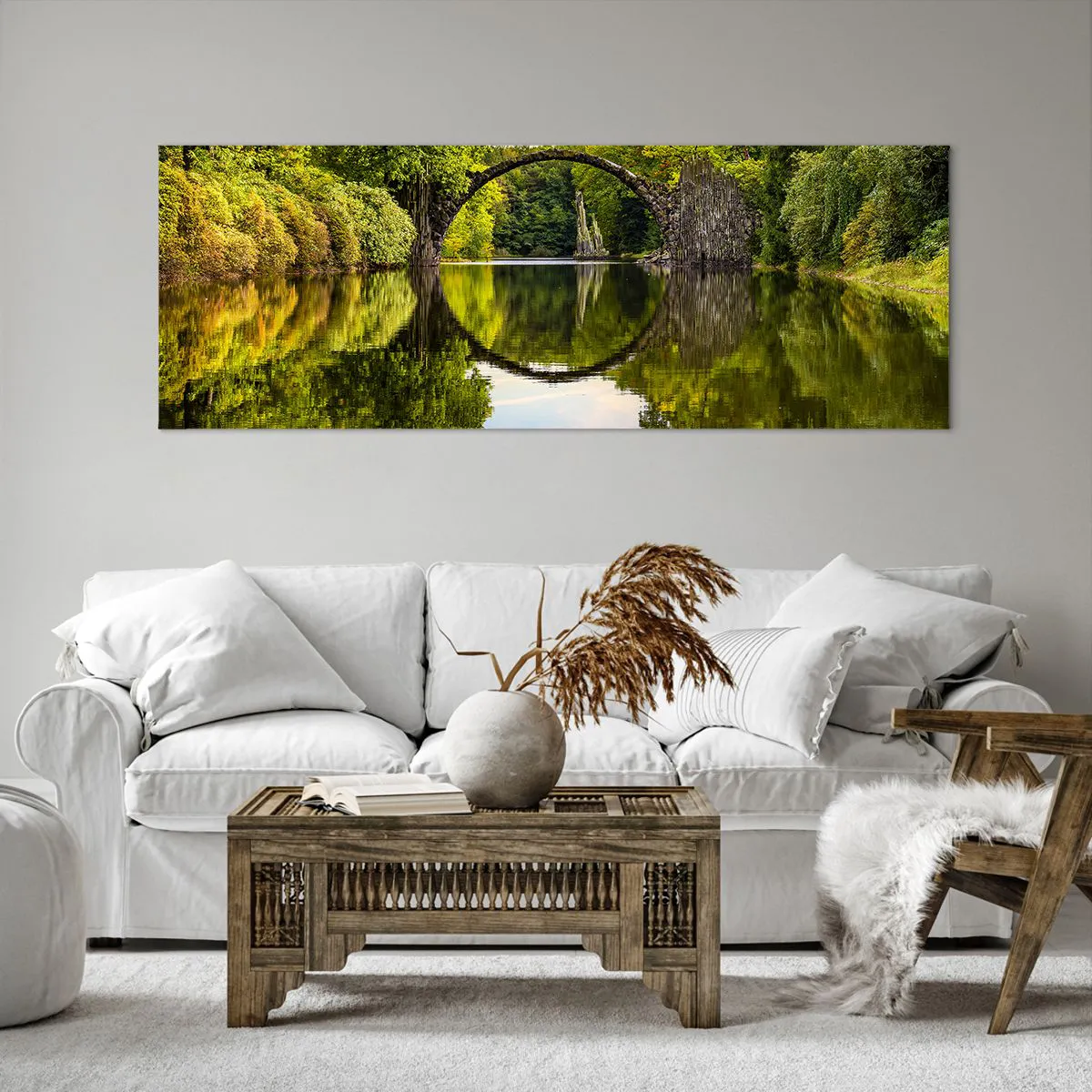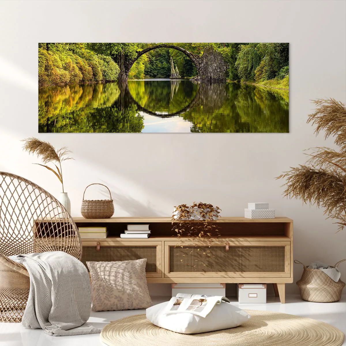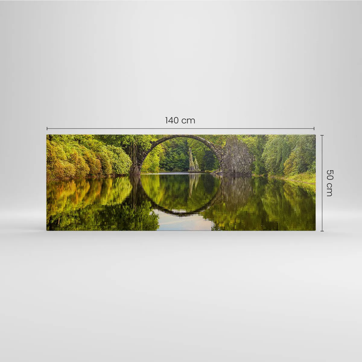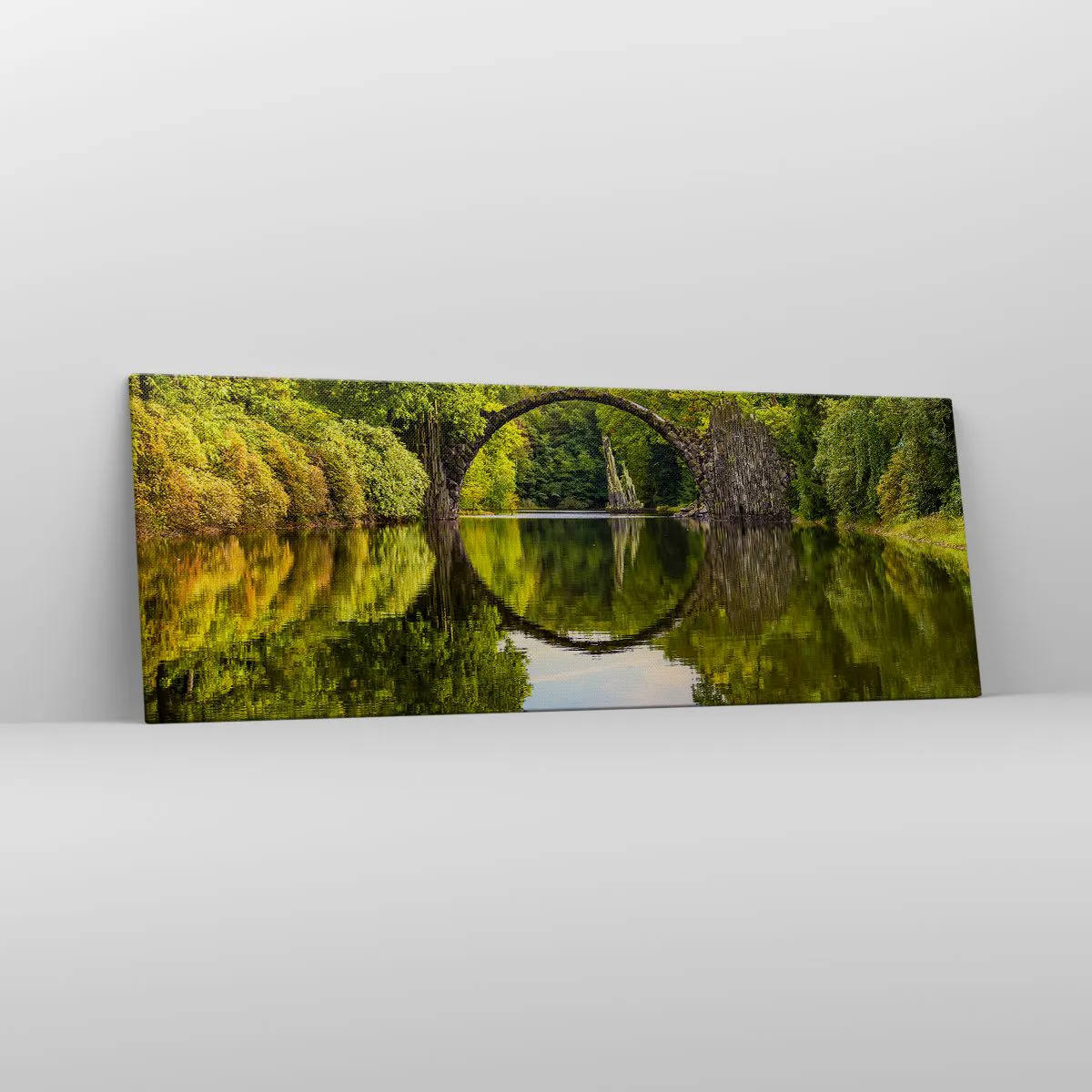 Impression sur toile - Image sur toile - Un pont de pierre sur une rivière avec un reflet parfait dans l'eau - 140x50cm - À la jonction de deux mondes - Décoration murale moderne pour le salon et la chambre ARTTOR