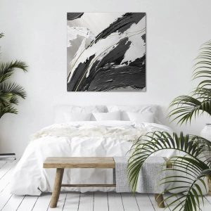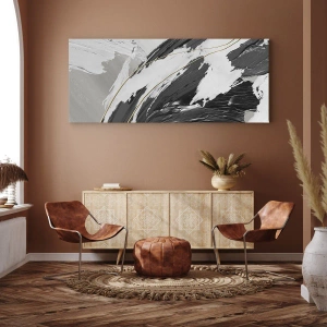 "Abstraction à grande échelle" est une peinture sur toile extraordinaire qui attire le regard par ses traits de peinture noirs et blancs dynamiques et une subtile touche dorée. Ce design unique au format horizontal de 70 x 50 cm s'intègre parfaitement aux tendances de la décoration intérieure moderne.