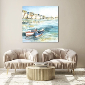 En arrière-plan se dressent des falaises rocheuses lumineuses, sur lesquelles se dressent des maisons aux façades délicatement accentuées. L'architecture rappelle les petites villes côtières du sud de l'Europe, pleine de charme et de simplicité. Cette vue paisible et harmonieuse est idéale pour les espaces de détente et d'inspiration, tels que les chambres, les salons ou les espaces détente.