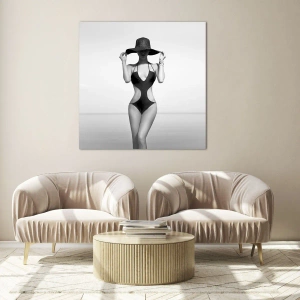 Impression sur verre - Image sur verre - Une femme en maillot de bain noir et chapeau contre la mer - 120x80cm - Mon prénom? Élégance - Décoration murale moderne pour le salon et la chambre ARTTOR