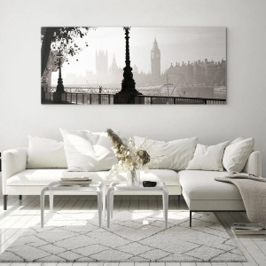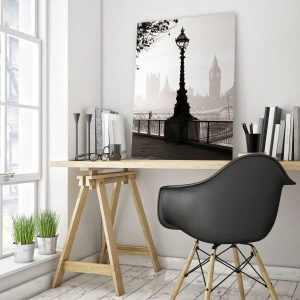 - Cette photographie pleine d'atmosphère représente la promenade londonienne, avec vue sur Big Ben. Le noir et blanc confère à la scène une touche rétro et un charme intemporel.