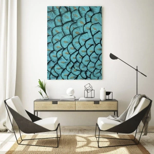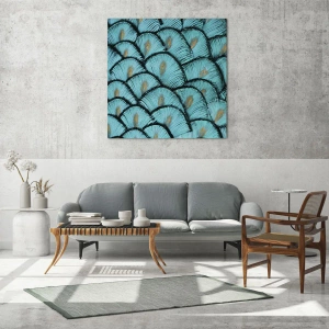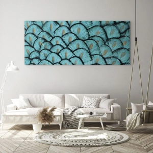 Impression sur verre - Image sur verre - Un motif ressemblant à des écailles turquoise avec des accents dorés - 80x120cm - Le grand gala des plumes - Décoration murale moderne pour le salon et la chambre ARTTOR