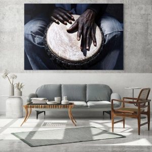 - Gros plan de mains jouant sur un djembé traditionnel, sur fond de denim. L'image respire le rythme, l'énergie et la puissance de l'expression musicale. Une décoration idéale pour les intérieurs modernes et les espaces artistiques.