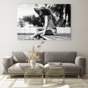 Décoration murale « Rêve d'été » est une image empreinte de sophistication, de détente et de tranquillité estivale. Elle représente une femme élégante coiffée d'un grand chapeau, assise au bord de la piscine, les pieds dans l'eau. L'image est entièrement réalisée en noir et blanc, ce qui renforce l'impression de classe, de subtilité et de nostalgie.