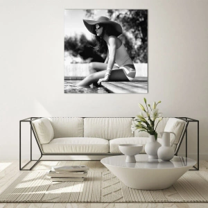 Impression sur verre - Image sur verre - Femme portant un chapeau assise au bord de la piscine en noir et blanc - 70x50cm - Rêve d'été - Décoration murale moderne pour le salon et la chambre ARTTOR