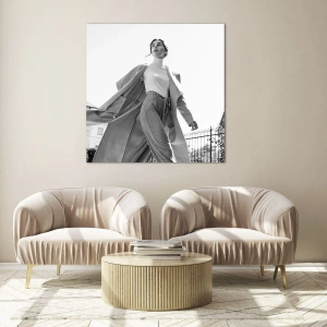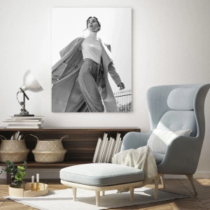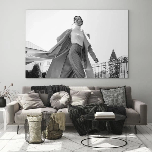 Impression sur verre - Image sur verre - Une femme élégante en mouvement sur fond d'architecture urbaine - 50x70cm - Tu viens avec moi? - Décoration murale moderne pour le salon et la chambre ARTTOR