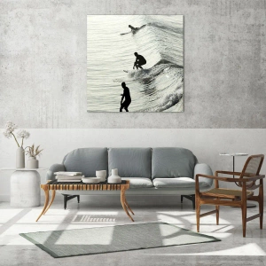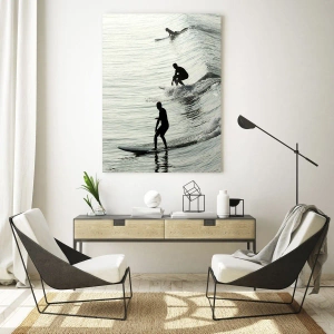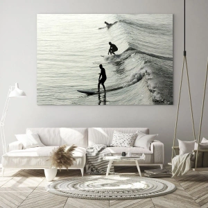 Impression sur verre - Image sur verre - Trois surfeurs surfant sur les vagues le matin - 120x80cm - A la rencontre de la vague - Décoration murale moderne pour le salon et la chambre ARTTOR