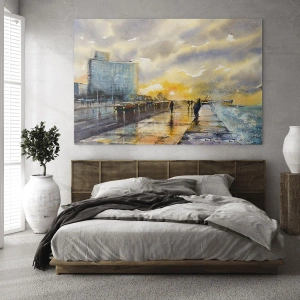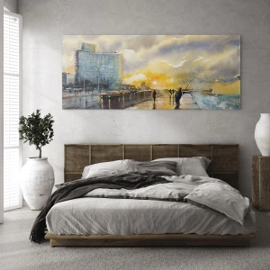 Impression sur verre - Image sur verre - Aquarelle d'une ville balnéaire avec coucher de soleil - 50x70cm - La vie sur le rivage - Décoration murale moderne pour le salon et la chambre ARTTOR