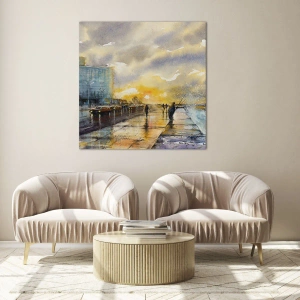 La peinture sur verre est faite sur un verre de 4 mm d'épaisseur. Les bords du verre ont une arête trapézoïdale mate. La tableau est sûr à l'utilisation et prêt à être accroché - il a des crochets en métal attachés à l'arrière du cadre et des entretoises en mousse permettant la régulation uniforme de la distance du tableau au mur.