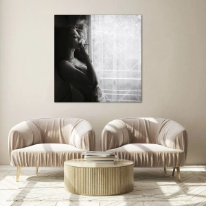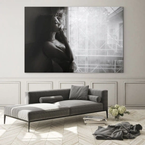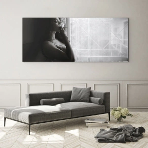 Impression sur verre - Image sur verre - Une femme dans une pose sensuelle sur une photographie en noir et blanc - 140x50cm - Vous sentez-vous libre ? - Décoration murale moderne pour le salon et la chambre ARTTOR