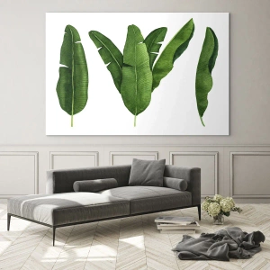 Impression sur verre - Image sur verre - Quatre feuilles de bananier vertes sur fond blanc - 120x80cm - Symétrie verte - Décoration murale moderne pour le salon et la chambre ARTTOR