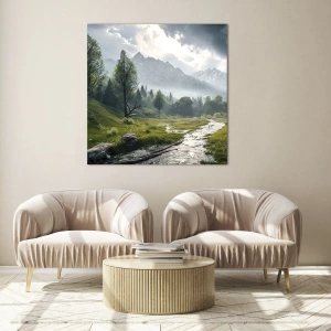 Impression sur verre - Image sur verre - Un paysage de montagne avec une rivière et des arbres entourés de montagnes brumeuses - 140x50cm - Aller et retour - Décoration murale moderne pour le salon et la chambre ARTTOR