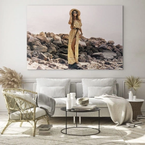 Le tableau « Magie des pierres » est une composition unique alliant l'élégance féminine à la sensualité de la nature. Au premier plan, on aperçoit une femme élégante vêtue d'une longue robe fluide aux tons jaunes, ceinturée d'une fine ceinture. Un chapeau et des lunettes de soleil foncées complètent sa tenue estivale dans l'esprit bohème, qui met l'accent sur la simplicité, la liberté et la proximité avec la nature. La silhouette de la femme se détache sur un rivage rocheux, créant un contraste entre la subtilité de la silhouette et la rudesse du paysage.