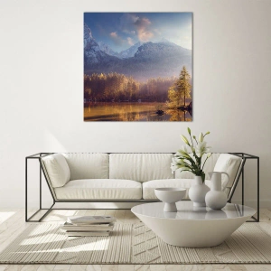 Impression sur verre - Image sur verre - Lumière dorée du matin sur un lac de montagne entouré de forêt - 70x50cm - Dans les montagnes et les vallées - Décoration murale moderne pour le salon et la chambre ARTTOR