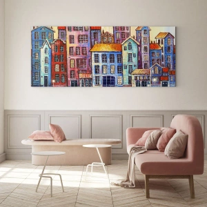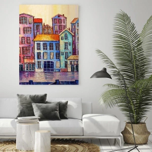 Impression sur verre - Image sur verre - Des immeubles colorés se reflètent dans l'eau - 50x70cm - Une ville comme dans un conte de fées - Décoration murale moderne pour le salon et la chambre ARTTOR