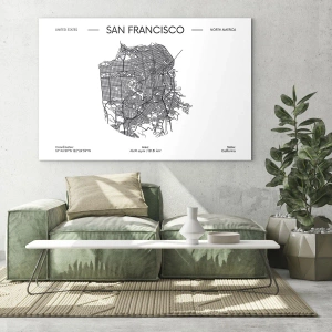 Le plan des rues de San Francisco, qui domine la composition, séduit par ses détails et sa clarté. Le dessin des rues, des intersections et des contours des quartiers forme un motif géométrique qui attire le regard et ajoute une atmosphère architecturale à l'intérieur. Ce style est parfait pour les intérieurs modernes, loft et scandinaves. Le motif évoque un plan urbain schématique, ce qui plaira aussi bien aux amateurs d'architecture qu'à ceux qui apprécient l'esthétique de l'ordre et de la structure. Ce design unique allie expression artistique et précision du dessin technique. Ce tableau, aux couleurs sobres, sera un excellent choix pour un salon, un bureau élégant ou une chambre, où il peut à la fois jouer un rôle décoratif et apporter une touche intellectuelle. Ce type de tableau sur verre allie art et fonctionnalité : il offre une décoration discrète, tout en étant intrigante et inspirante. L'intensité des couleurs du tableau, discrète, lui permet de s'intégrer facilement à une grande variété d'aménagements, des plus minimalistes aux plus éclectiques. Grâce au thème universel du plan de ville, ce produit s'adapte à tous les goûts.