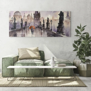 Impression sur verre - Image sur verre - Vue romantique d'un pont avec un parapluie sur fond de ville en soirée - 140x50cm - Les gens ne changent pas - Décoration murale moderne pour le salon et la chambre ARTTOR
