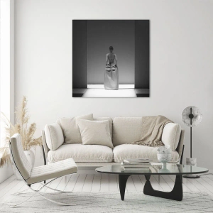 Impression sur verre - Image sur verre - Une photo en noir et blanc d'une femme en robe sur fond de lumière. - 50x70cm - Simplicité raffinée - Décoration murale moderne pour le salon et la chambre ARTTOR