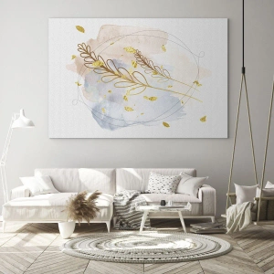 - Une composition artistique de brindilles et de feuilles dorées sur un fond aquarelle pastel. Une décoration unique et légère, au caractère subtil et aux formes modernes.