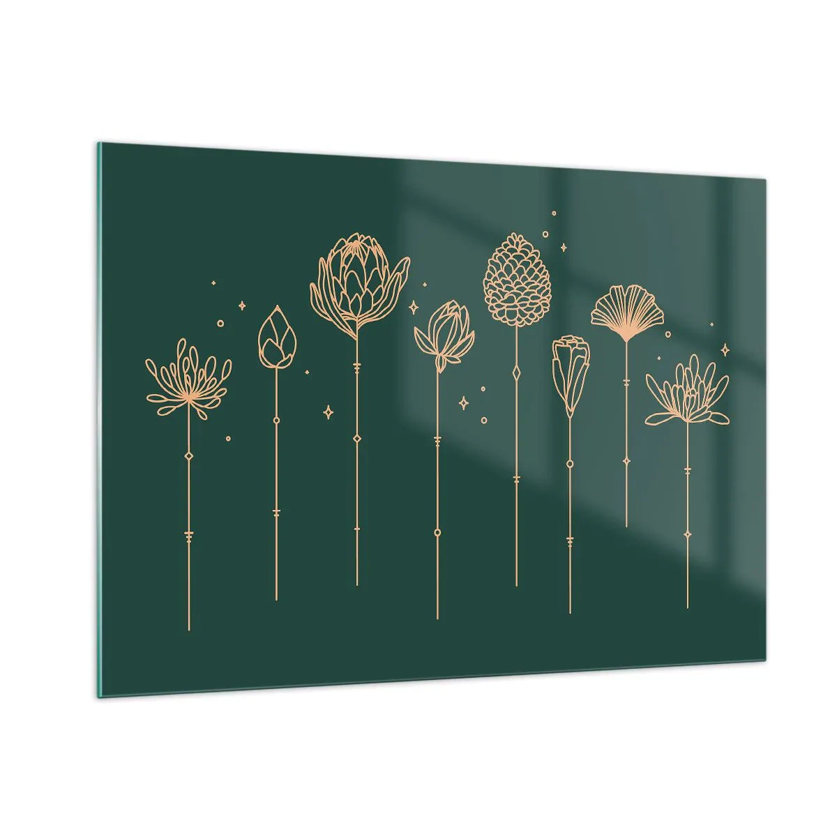Impression sur verre - Image sur verre - Contours dorés d'herbes et de fleurs sur un fond vert foncé - 100x70cm - La famille Plante - Décoration murale moderne pour le salon et la chambre ARTTOR