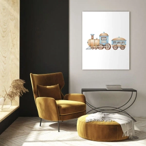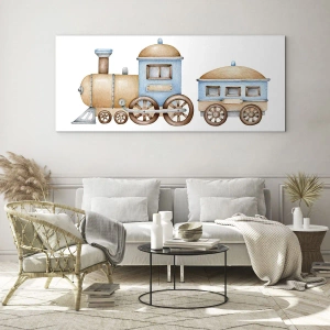 Impression sur verre - Image sur verre - Illustration d'un train à vapeur dans les tons bleu et beige sur fond blanc - 50x70cm - Il est à la gare... - Décoration murale moderne pour le salon et la chambre ARTTOR