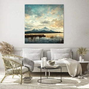 Impression sur verre - Image sur verre - Un paysage pittoresque avec une montagne et un lac calme - 70x100cm - Sous la protection du ciel - Décoration murale moderne pour le salon et la chambre ARTTOR