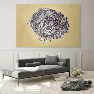 Impression sur verre - Image sur verre - Un poisson de dessin animé avec des ornements sur un fond beige - 50x70cm - D'un océan d'ornements - Décoration murale moderne pour le salon et la chambre ARTTOR