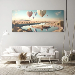 Décoration murale - L'amour vous emmène en plein essor - Ballons en forme de cœur au-dessus d'un paysage féerique avec une rivière