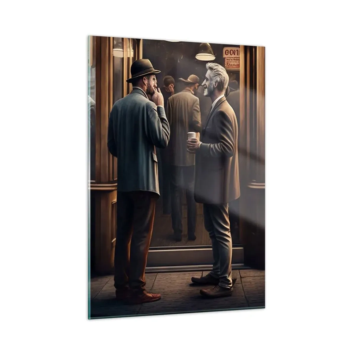 Impression sur verre - Image sur verre - Hommes discutant devant un café dans un décor urbain rétro - 50x70cm - Bon moment de la journée - Décoration murale moderne pour le salon et la chambre ARTTOR