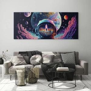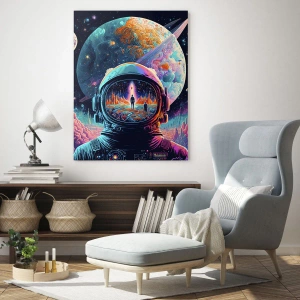 Impression sur verre - Image sur verre - Un paysage spatial avec un astronaute et une planète surréaliste. - 120x80cm - Les philosophes n'en ont pas rêvé - Décoration murale moderne pour le salon et la chambre ARTTOR