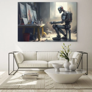 Impression sur verre - Image sur verre - Un robot peignant des tableaux dans un atelier d'art - 50x70cm - L'acte de création - Décoration murale moderne pour le salon et la chambre ARTTOR