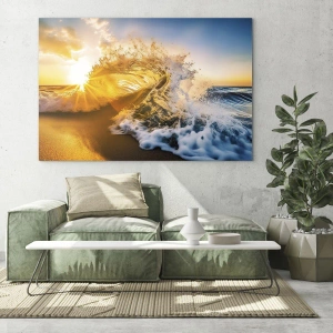 Impression sur verre - Image sur verre - Une vague s'écrasant contre le rivage, illuminée par les rayons du soleil couchant - 120x80cm - S'amuser dans le sable - Décoration murale moderne pour le salon et la chambre ARTTOR