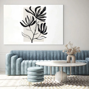Les couleurs dominantes sont le noir et le beige, qui s'intègrent parfaitement au minimalisme. Le motif végétal est présenté de manière libre et naturelle, comme esquissé à l'encre sur papier, ce qui souligne le caractère artistique de la composition. Ce style rend ce tableau parfait pour les intérieurs à la décoration calme et sobre.