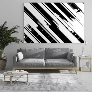 « Composition intense et dynamique » est une abstraction basée sur le noir et blanc, dans laquelle le minimalisme se marie à un rythme graphique et à une forme dynamique. Les rayures diagonales et les motifs vieillis créent un message visuel fort.
