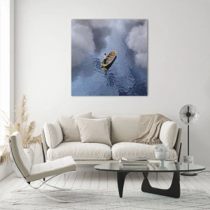 Impression sur verre - Image sur verre - Un homme dans un bateau sur une mer calme entourée de nuages - 120x50cm - Vie – voyage – inconnu - Décoration murale moderne pour le salon et la chambre ARTTOR