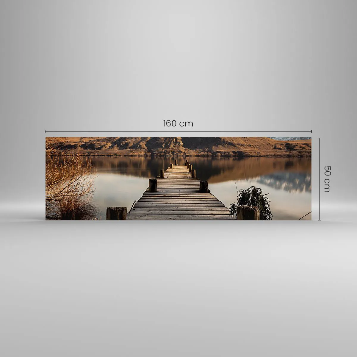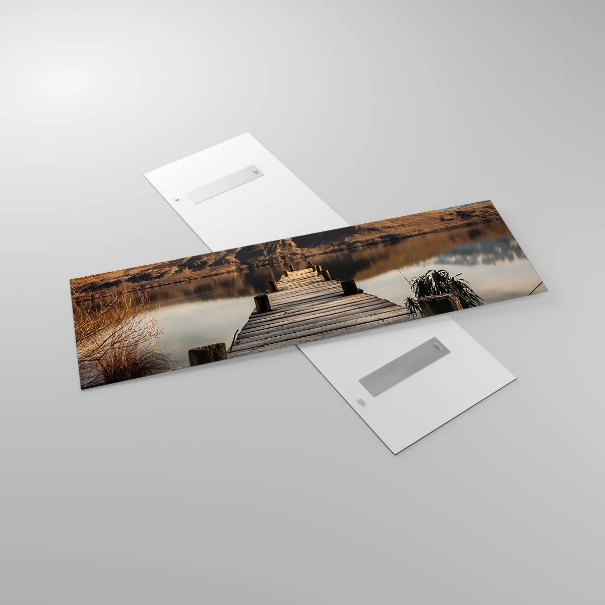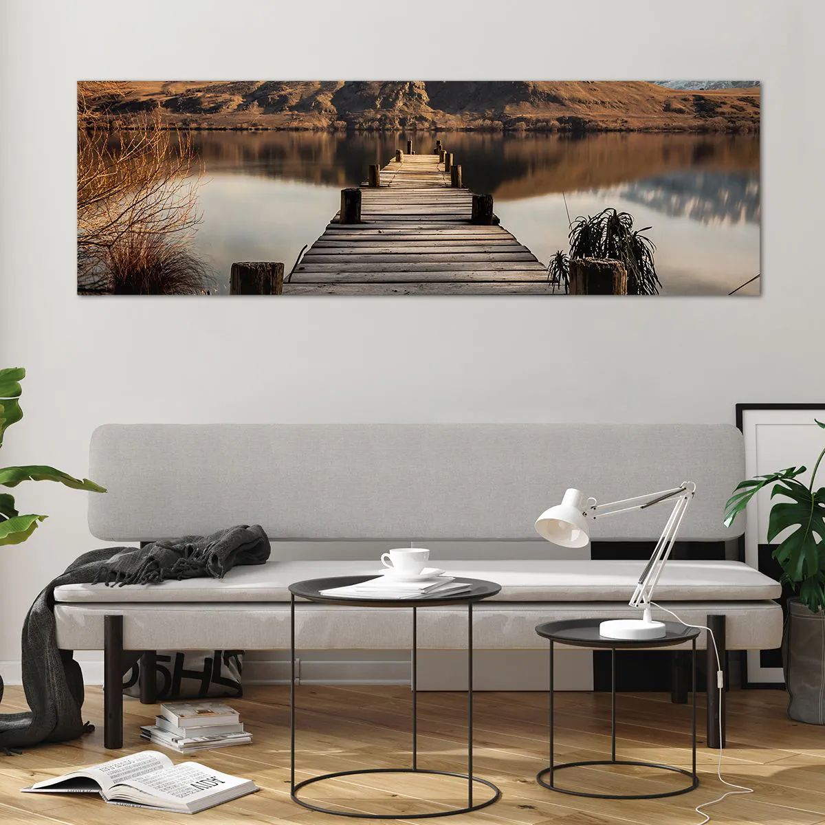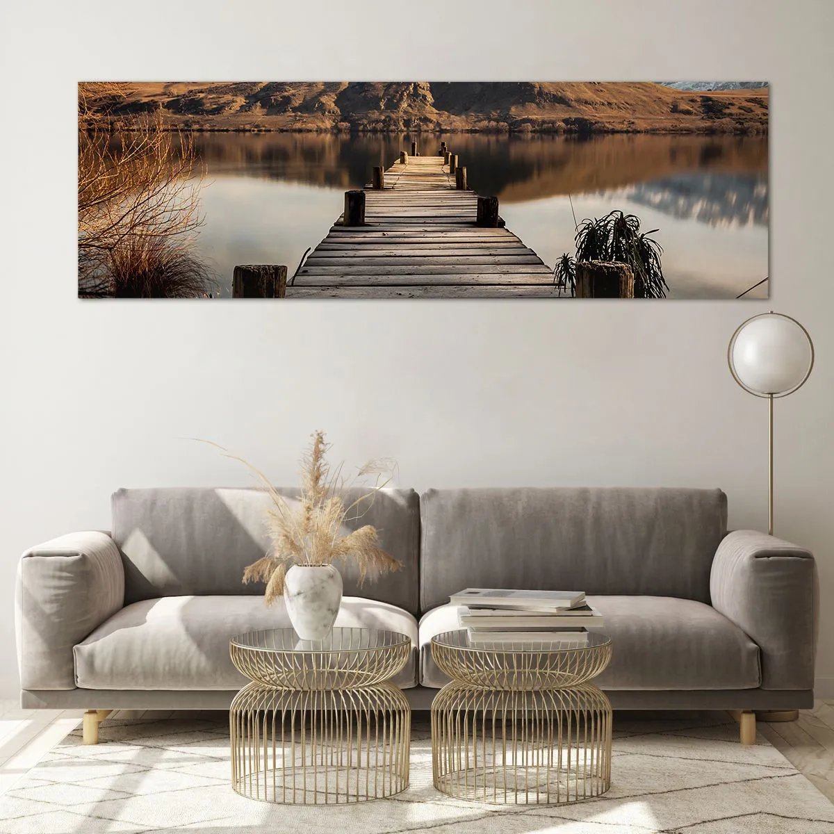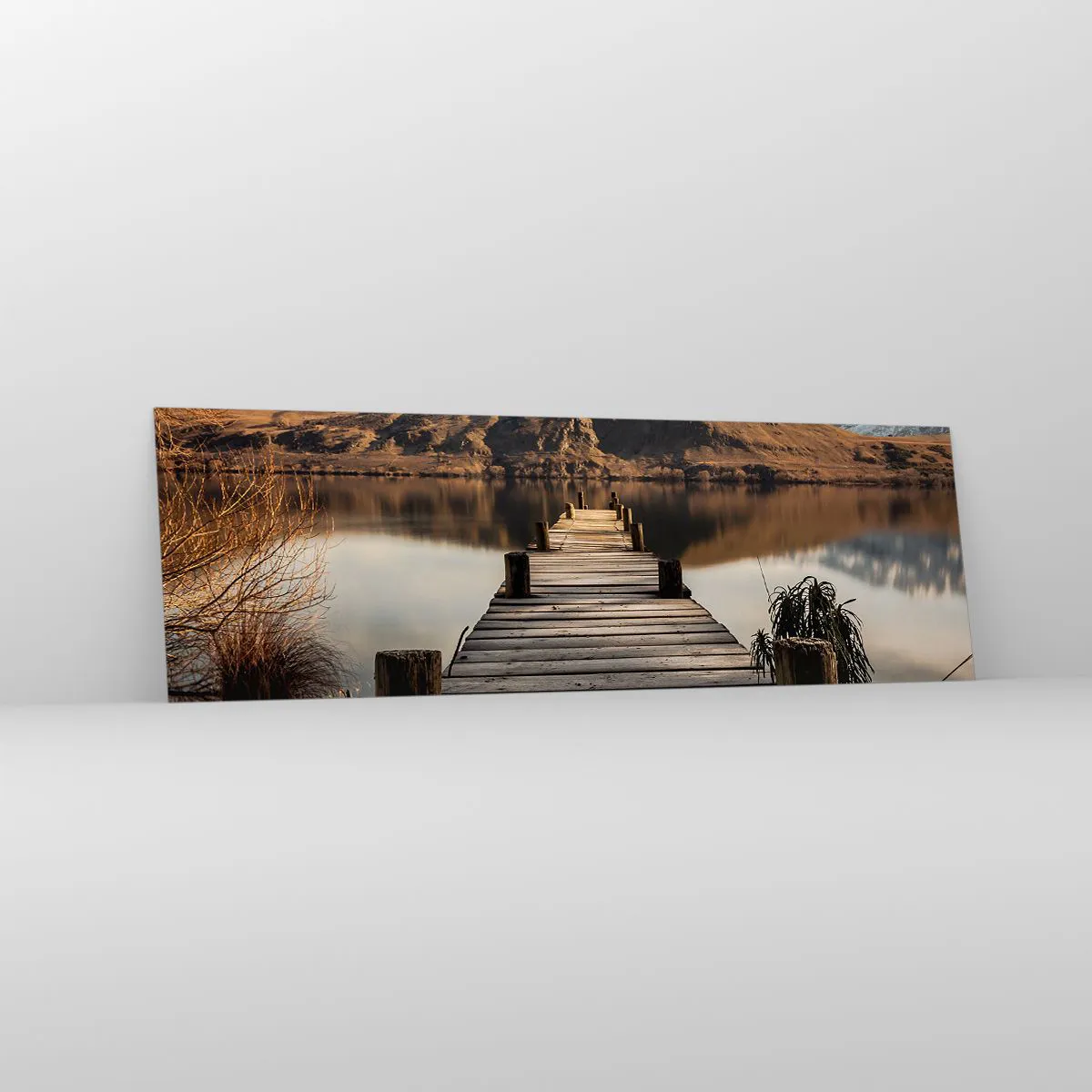 Impression sur verre - Image sur verre - Une jetée en bois sur un lac entouré de collines pittoresques - 160x50cm - Paysage silencieux - Décoration murale moderne pour le salon et la chambre ARTTOR