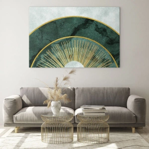Impression sur verre - Image sur verre - Rayons dorés sur fond de demi-cercles verts avec une structure en marbre - 70x50cm - Un autre système solaire - Décoration murale moderne pour le salon et la chambre ARTTOR