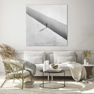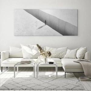 Impression sur verre - Image sur verre - Une silhouette solitaire se tient au-dessus d'un gouffre profond dans un décor monochrome. - 140x50cm - Un objectif clair - Décoration murale moderne pour le salon et la chambre ARTTOR