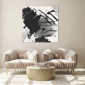 • Une peinture abstraite moderne, exécutée en noir et blanc contrasté. Des coups de pinceau dynamiques lui confèrent un caractère expressif et audacieux.