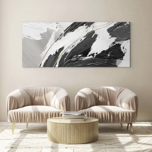 Impression sur verre - Image sur verre - Traits dynamiques en noir et blanc avec une touche dorée - 70x50cm - L'abstraction à grande échelle - Décoration murale moderne pour le salon et la chambre ARTTOR
