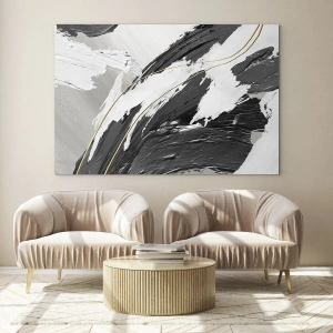 L'association du noir et du blanc est intemporelle et prend ici une nouvelle dimension grâce à l'utilisation de détails dorés. Ces lignes délicates rompent l'atmosphère monochrome, apportant une touche de luxe et de finesse artistique. Ce tableau décore et définit le style de votre intérieur.