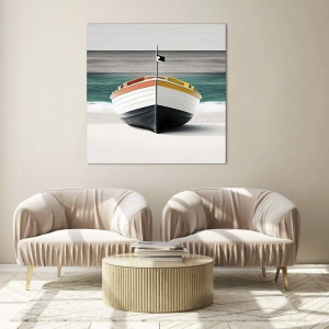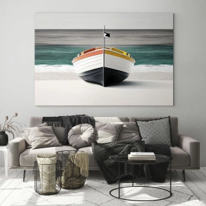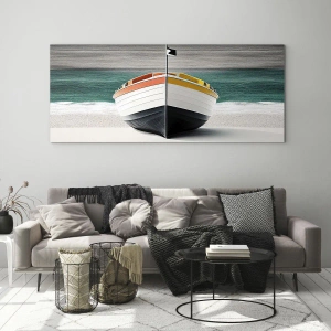 Impression sur verre - Image sur verre - Un bateau sur la plage avec une mer turquoise en arrière-plan - 70x100cm - A sa place - Décoration murale moderne pour le salon et la chambre ARTTOR
