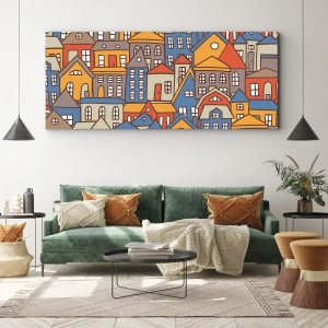 Impression sur toile - Image sur toile - Maisons colorées dans un style graphique sur fond clair - 120x80cm - Derrière la maison, une maison - Décoration murale moderne pour le salon et la chambre ARTTOR