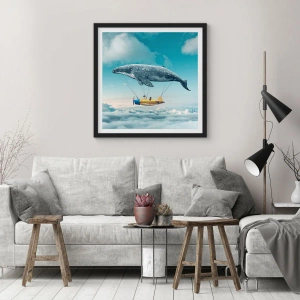 Affiche dans un cadre noir - Poster - Une baleine volante transporte un avion dans un décor surréaliste. - 70x50cm - Pourquoi pas? - Décoration murale moderne pour le salon et la chambre ARTTOR