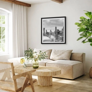 L'affiche « Paysage américain » est un panorama urbain élégant et plein de caractère représentant des gratte-ciel modernes enveloppés de brouillard et de nuages. La palette de couleurs noir et blanc ajoute une touche d'élégance et d'intemporalité à l'image, s'intégrant parfaitement aux intérieurs modernes de style industriel ou loft.