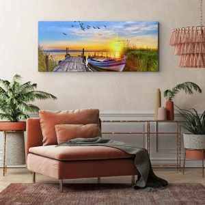 • Le tableau représente une jetée en bois menant à un lac, où un bateau amarré se reflète dans les eaux calmes. Le coucher de soleil et le vol des oiseaux confèrent à l'œuvre une atmosphère harmonieuse et nostalgique.