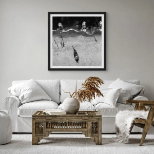 Affiche dans un cadre noir - Poster - Une photographie aérienne en noir et blanc d'un bateau sur une plage - 50x70cm - Toujours sur le rivage… - Décoration murale moderne pour le salon et la chambre ARTTOR