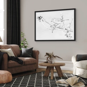 - L'affiche présente un dessin en noir et blanc d'un oiseau perché sur une branche. Sa forme minimaliste et ses couleurs monochromes soulignent l'élégance et la subtilité de la composition, s'intégrant parfaitement aux intérieurs modernes.